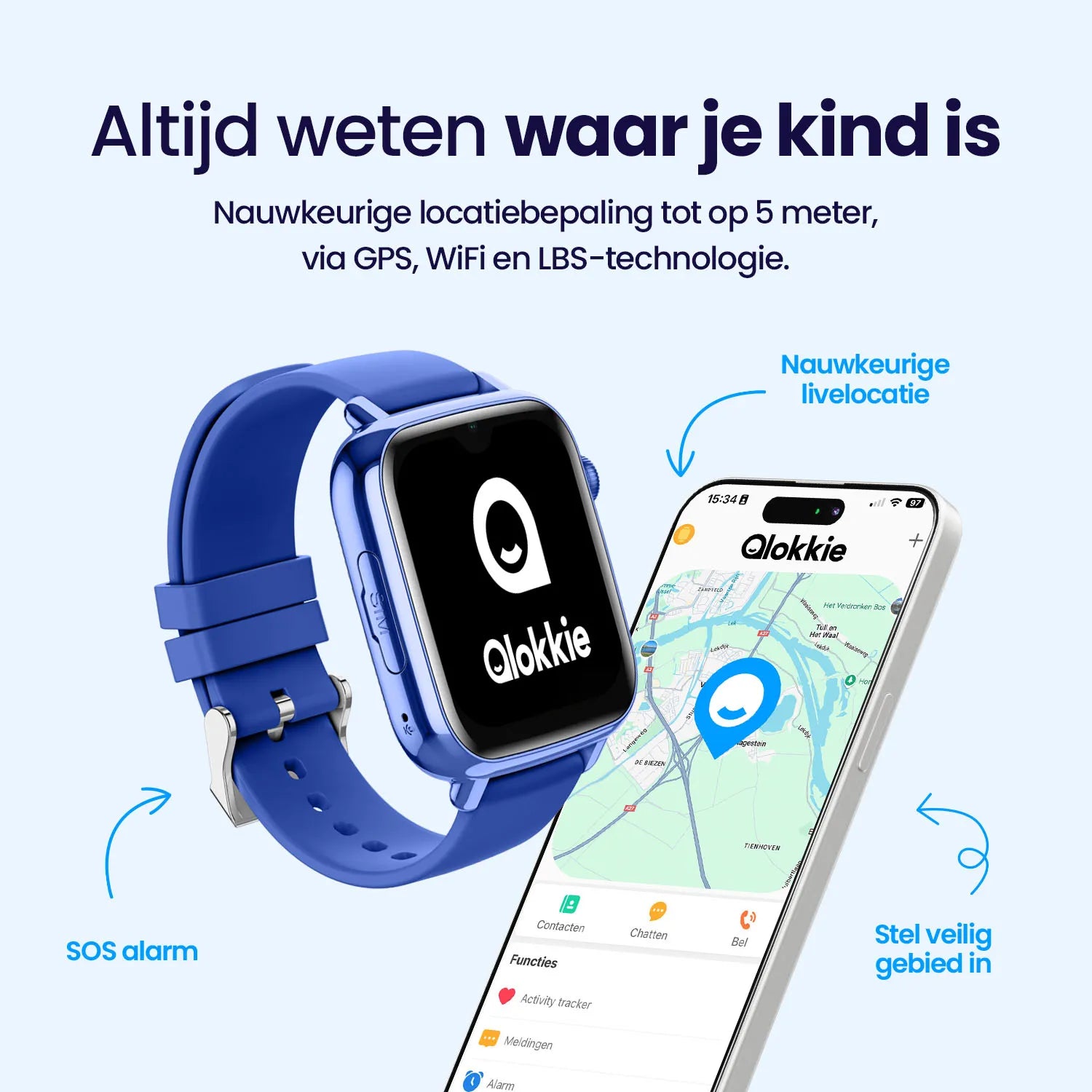 Qlokkie biedt een gratis app voor uw telefoon waarmee u op ieder moment de locatie van uw kind kunt zien, op 5 meter nauwkeurig. Het GPS-horloge is voorzien van handige functies als spraakberichten, videobellen en een SOS-functie waarmee uw kind u altijd onmiddellijk kan bereiken.