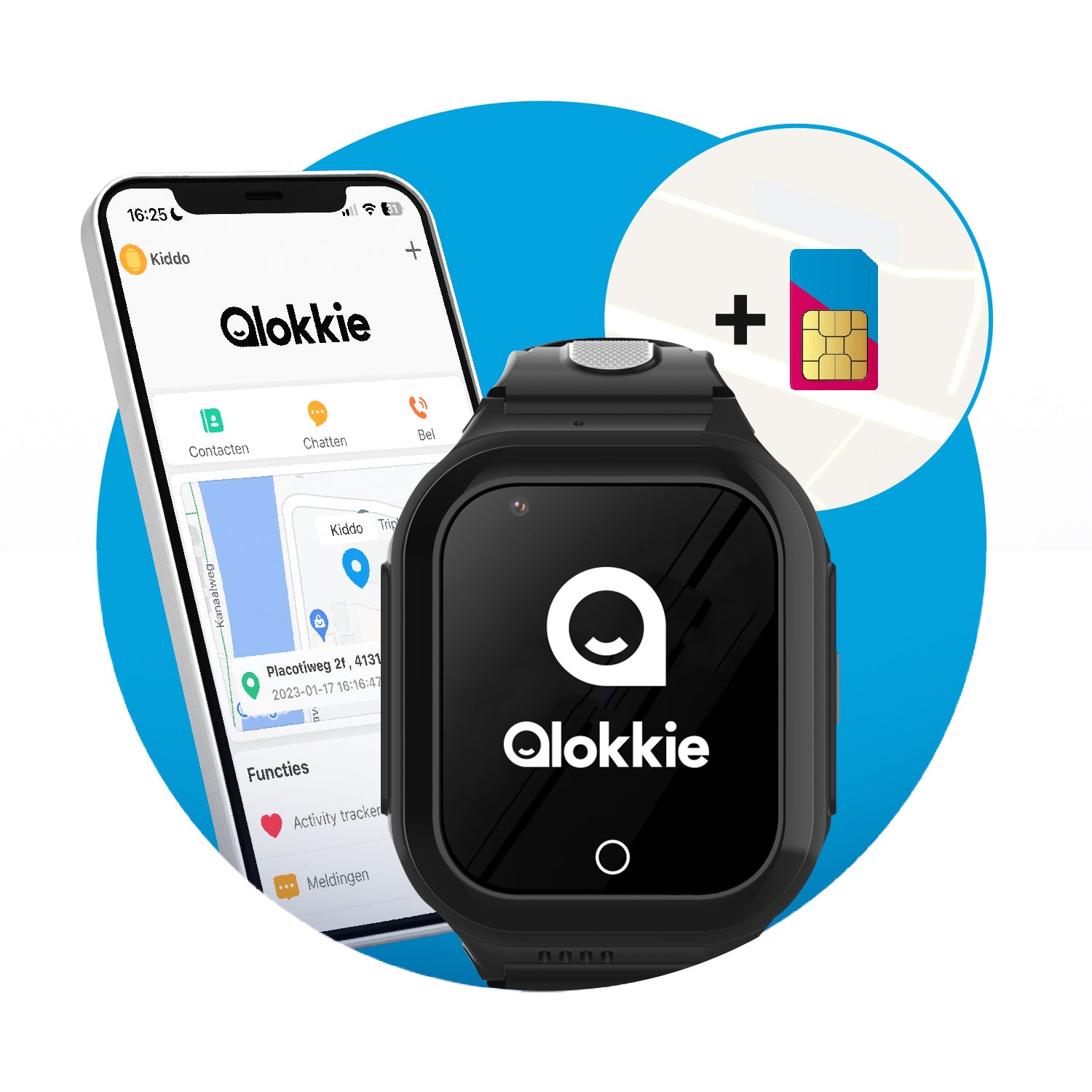Om te kunnen verbinden met mobiele netwerken en de diverse functies te kunnen gebruiken, is er een simkaart met beltegoed nodig. Je ontvangt bij het horloge een gratis simkaart t.w.v. €15 & 1GB. Het installeren van het horloge verloopt vlot en bestaat uit vier simpele stappen: activeer de simkaart, laad het horloge op, download de app en verbind het horloge.